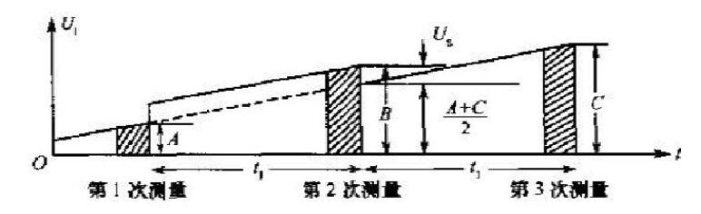 (a)方波磁场的感应强度(理想情况), (b)由电扳2个电压Ue的测量值差得出有用电压Uu.。 当温度或被测介质的化学关系发生变化时,电化学干扰电压不再保持恒定,而是以一定的时间间隅(几秒到几分)变化。因为纯化学直流干扰电压变化的时间远大于测量周期的时间,所以在此间隔中这种变化可近似看做与时间呈线性关系的变化。这样,在测量时采用简单的线性插补方法可使电化学干扰电压的变化和由此所引起的误差(见图3.8)得到抑制。为了达到此目的,在磁场关断时测得1个值是电化学直流干扰电压(A值);然后接通磁场;当磁场感应强度达到较大值之后,测得的2个值是平均变化的电化学直流干扰电压和有用信号叠加值(B值)。当磁场再次关断时,量测的3个值是经间隔时同后上升的电化学直流干扰电压(c值)。2个不同的电化学直流干扰电压(A值和c值)的平均值与B值的叠加信号相减便获得有用的电压信号值Ub。