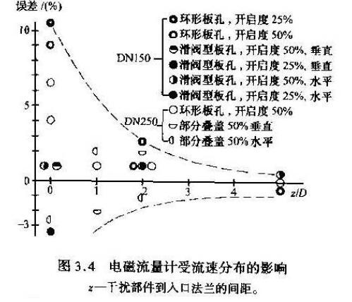 图3在参考条件下智能电磁流量计的典型误差范围 4)线性测量 虽然流速”(流量q)和电压信号U之间呈线性关系,但需要采用变送器进行信号处理、大测量范围调整和对脉动流量的修正。 5)与粘度和密度无关 在紊流和层流的转换(或逆转换)过程中,由于传感器结构的问题会出现较小的测量误差,这里要使用安装短八口引导管道的方法来解决。 图3 4的测量结果表明受干扰的流速分布对智能电磁流量计的测量精度仅有微小的影响。此图还表示r在智能电磁流量计内径与系统管道内径相同时,仅需要使用5倍于测量管道内径长度的无干扰人口引导管就可达到很高的测量精度。